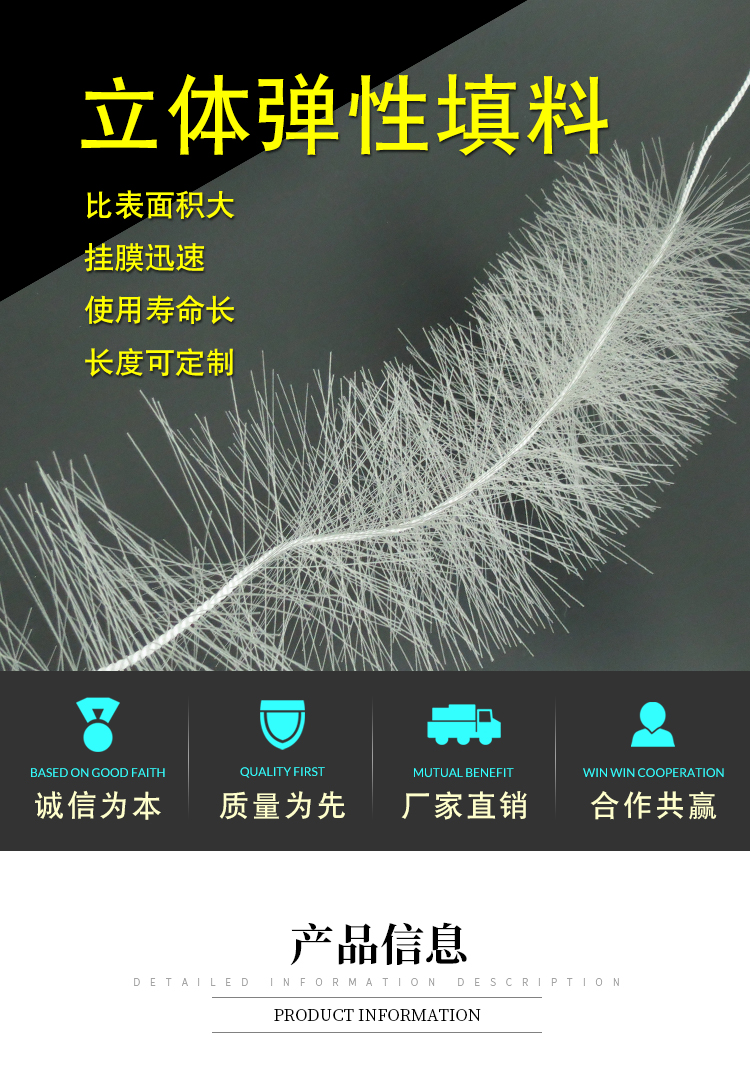 立體彈性填料材質(zhì)選用聚烯烴類,具有耐腐蝕、耐高溫、耐老化的優(yōu)質(zhì)塑料材料,該產(chǎn)品使用壽命長(zhǎng),充氧性能好。由于絲條的特殊結(jié)構(gòu),因而掛后的比表面積成倍增大,且掛膜、脫膜容易,生物膜活性強(qiáng)。耐高負(fù)荷沖擊,處理效果顯著,運(yùn)行管理方便,不堵塞,不結(jié)團(tuán)。在不同水質(zhì)工程應(yīng)用時(shí),可調(diào)節(jié)絲條粗細(xì)和組裝形式,完全適用于各種廢水的厭氧、兼氧、好氧等處理工藝。
